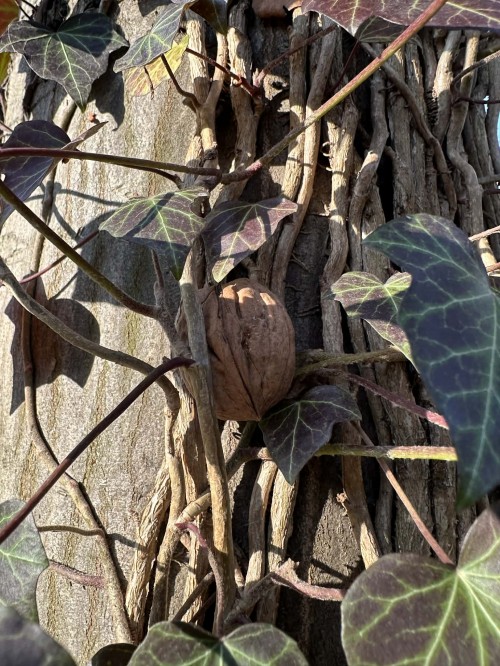 Wiewiórki łazienkowskie uwielbiają ukrywać orzechy w pędach bluszczu.